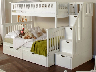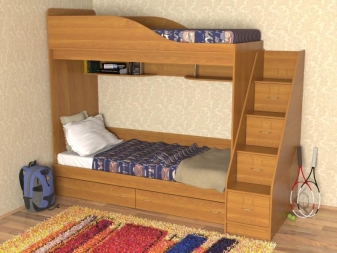 - سرير بدورين. هذا الخيار شائع أيضًا في سوق الأثاث. يشغل المنتج مساحة صغيرة وفي نفس الوقت يعمل بشكل جيد. هناك خيارات ليس فقط مع خزانة ذات أدراج ، ولكن أيضًا مع طاولة للفصول. يمكنك وضع كل العناصر التي تحتاجها في الأدراج. سيكون من الممكن الصعود على السرير باستخدام الدرجات.