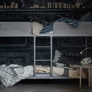 - إطار بطابقين “Tuffing” يمكن وضع اللون الرمادي الداكن في غرفة ذات أسقف منخفضة ، حيث يبلغ ارتفاعها 130 سم فقط ، ويكون الدرج في المنتصف ، لذلك لن يسقط الطفل الذي ينام في الطبقة السفلية بالتأكيد ، ويتم تثبيت جوانب شبكية في الأعلى.