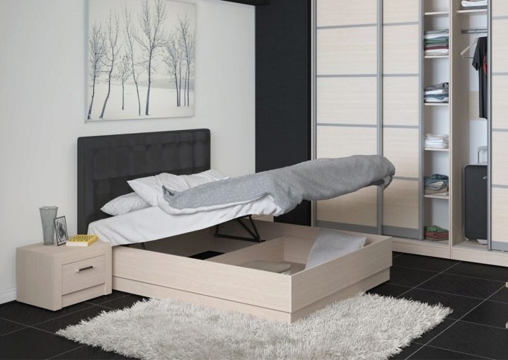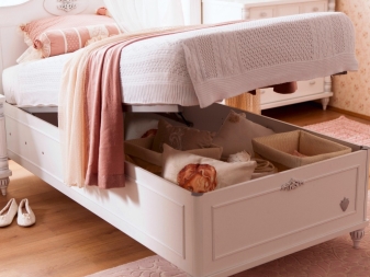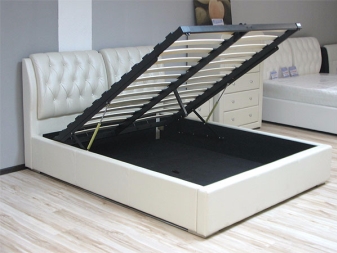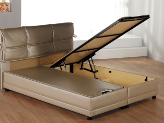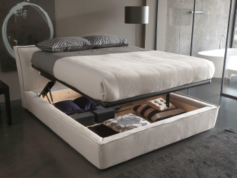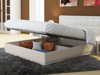 يتمتع نظام التخزين أسفل القاعدة بمزايا واضحة مقارنة بخيارات السحب والطرح. إنه قوي ومريح. من أجل استخدام مكانة متخصصة ، لا يتعين عليك سحب الأدراج ، التي تشغل مساحة خالية متواضعة بالفعل. وحتى في غرف النوم الفسيحة ، من الأسهل والأكثر ملاءمة رفع القاعدة بدلاً من نقل شيء ما وإفراغه في مكان ما..