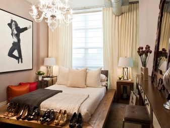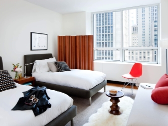 عند وضع سرير في شقة من غرفة واحدة ، حيث تعمل الغرفة في وقت واحد كغرفة معيشة وغرفة نوم ودراسة ، فإن الخيار الأفضل هو تقسيم الغرفة. إذا اخترت سريرًا ، فحاول “إخفاءه” عن أعين المتطفلين بمساعدة ستارة من الموسلين. ومع ذلك ، بالنسبة لشقة من غرفة واحدة ، فإن أفضل حل هو شراء سرير أريكة قابل للطي..