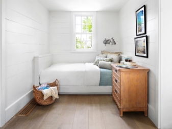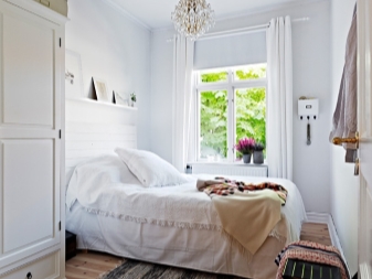 في هذه الغرفة ، يتم فصل السرير عن النافذة المفتوحة بقاعدة ناعمة عريضة ، والتي تتواءم تمامًا مع دور الجدار. يحمي هذا الشريط من كل من المسودات والضوء في نفس الوقت.