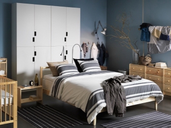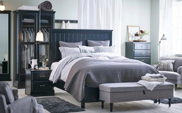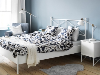 تبدو هذه الأسرة مريحة في داخل غرفة النوم وفي الداخل ايكيا نموذج أوبلاند. إطاره مصنوع من خشب مضغوط ومغطى بالرماد (غامق ، أسود تقريبًا) أو قشرة بلوط (فاتح) ، مما يجعل السرير متطورًا ومكلفًا. لوح رأس مرتفع (122 سم) مصنوع بالكامل من الخشب الرقائقي ، ومبطن بحشو البوليستر ومفروشات باللون الأزرق الداكن.