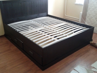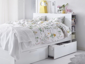 سرير Brusali لديها 4 صناديق تخزين واسعة تسحب للخارج: 2 لكل جانب. تم إنتاج النموذج بظلال من الأسود والبني والأبيض ، ولوح رأس بارتفاع 93 سم وقدم 46 سم. بالمناسبة ، يمكن شراء إطار سرير Brusali بشكل منفصل وبدون أدراج ، لكن يجب عليك أعترف ، بدونهم يفقد السرير وظائفه.