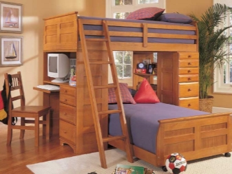 الهياكل من هذا النوع عملية للغاية ، ويتحقق ذلك من خلال تعظيم استخدام الفضاء.. يمكن استكمال الطبقة السفلية من السرير المصنوع من الخشب الطبيعي بالسمات التالية: