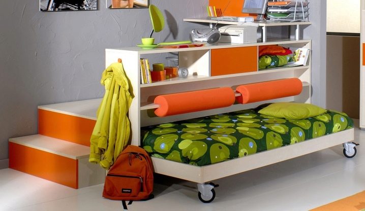 - أسرة صغيرة. الهياكل منخفضة الارتفاع. يوجد غالبًا عدة أدراج أو أرفف أسفل السرير..