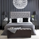 لمحبي التألق ، يمكنك اختيار سرير بأحجار الراين. في أغلب الأحيان تستخدم الأحجار الشفافة الكبيرة. تبدو رائعة على الأسرة الجلدية السوداء. توضع أحجار الراين على اللوح الأمامي أو حول حواف الأثاث. الضوء المنعكس على الحواف سوف يملأ الغرفة بتوهج لطيف.