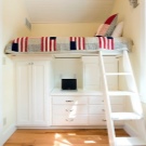 - خيار آخر مثير للاهتمام هو غرفة التخزين في الطابق الأول من سرير بطابقين. يمكن تنظيمه باستخدام ألواح زجاجية أو جدران من ألواح الجبس..