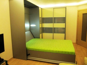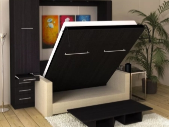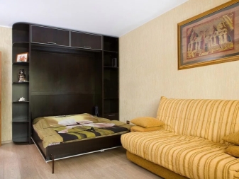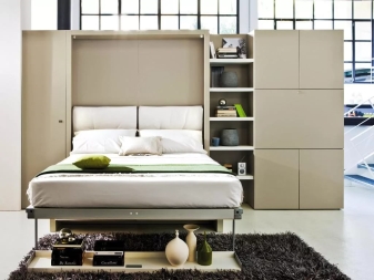 - سرير مدمج. تم دمج السرير المتحول في خزانة الملابس ، ويتم تضمين الطرز في خزائن غرفة المعيشة وأدوات المطبخ. هيكل الرفع المُجمَّع عبارة عن جدار خزانة. مفكك – إنه قاع من البلاستيك المعدني مع أرجل فولاذية قابلة للسحب ، حيث توجد مرتبة لتقويم العظام. Murphy هي واحدة من أشهر الشركات المصنعة للأسرة القابلة للطي التي تتراجع إلى الحائط ، ويتميز أثاث هذه العلامة التجارية بتصميم خشبي أنيق..