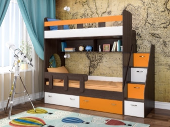 دور علوي بطابقين. هذا النموذج مثير للاهتمام لتصميمه ، فهو يتضمن خطوات ، مستويين ، قسم متحرك لتجنب السقوط من الأسفل وحتى الرفوف. النموذج الفردي مناسب للحضانة ، وهو مناسب لأن شراء سرير واحد سيوفر سريرين. قد يحب الأطفال تقليد مقصورة القطار ، مما يوفر الراحة ، وتوفر قوة مساند الظهر وارتفاعها الأمان. توجد الأدراج في كل خطوة. هذا السرير مثالي للتوائم الذين يرغبون في الحصول على نفس الشيء ولا يريدون الانفصال ، حتى في الليل..