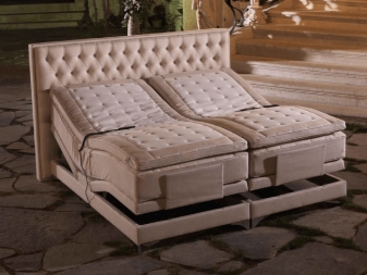 - أنظمة نوم غير عادية قابلة للتعديل. أحد خيارات النخبة لتنظيم مكان للنوم هو مكان للنوم مع إمكانية ضبط وضعية الرأس والظهر والساقين. يمكن القيام بذلك إما يدويًا أو باستخدام جهاز التحكم عن بعد. تم تجهيز أنظمة النوم بمراتب طبية ذات نوابض مختلفة الصلابة. يتم تقديم منتجات مماثلة من قبل الشركة الإنجليزية London Beds ، ويبدأ السعر من 120 ألف روبل. يسمح السرير ، عن طريق الضغط على جهاز التحكم عن بعد ، بنقل الشخص الذي يستريح إلى وضع مشاهدة التلفزيون ، وقد يكون هذا مناسبًا لكبار السن. التصميم الأصلي مناسب فقط لتصميم الغرفة الحديث.