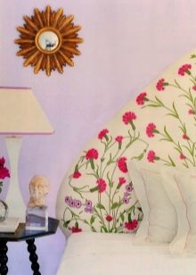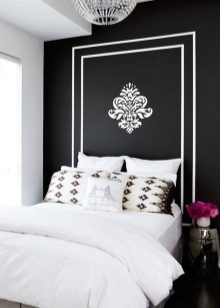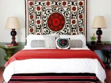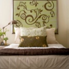 - الرسم بدلا من الظهير – فكرة أصلية تتيح لك توفير مساحة في الغرفة وضبط مزاجها. من أجل “إنتاج” هذا النوع من اللوح الأمامي ، يتم استخدام الإستنسل والطلاء المتباين – يجب ألا يندمج مع لون الجدران. من المستحسن أن يكون الرسم بحجم عرض السرير أو يتجاوز قليلاً محيطه ، يجب أن يتزامن مركز الظهر المرتجل مع مركز عرض السرير من أجل الانسجام والتناسق.