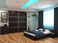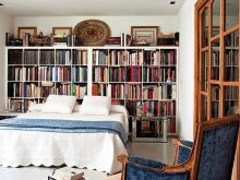 إذا كانت الغرفة كبيرة ، فيمكنك وضع سرير في وسطها ، في الجانب الآخر الحر – خزانة ملابس أو خزانة ملابس ، وسوف يقسم اللوح الأمامي غرفة النوم فعليًا وبصريًا إلى نصفين.