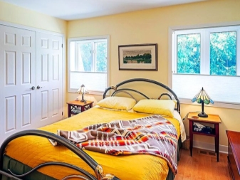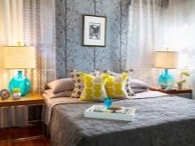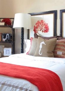 إذا كان السرير موجودًا بجوار النافذة ، فسيكون القرار الصحيح هو اختيار لوح أمامي منخفض أو غير مرتفع جدًا لإتاحة الوصول إلى الضوء الطبيعي. في هذه الحالة ، لا يتطلب السرير ديكورًا إضافيًا ، ويمكن أن تكون الستائر أو الستائر المتجمعة الثقيلة على طول حواف الجدار بمثابة الأخير. كلكنة ، يمكنك تعليق لوحتين فوق كل طاولة سرير ، حيث لا يمكنك وضعها فوق الخلف بسبب النافذة..