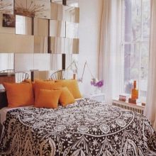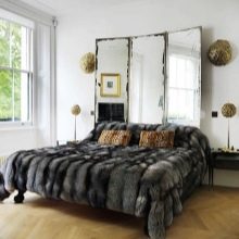- مع مرآة. تعمل المرآة والأسطح اللامعة على زيادة المساحة بصريًا ، مما يعني أنه لا غنى عنها في داخل غرف النوم الصغيرة. الموقع الأكثر نجاحًا هو رأس السرير وليس أمامه – يقول خبراء النوم إن المرآة المثبتة مقابل السرير تتداخل مع النوم وتؤثر بشكل عام سلبًا على الشخص. ليس من الضروري استخدام مرآة في شكلها النقي: فالمرآة العتيقة أو المصطنعة مناسبة لخلق جو أرستقراطي.