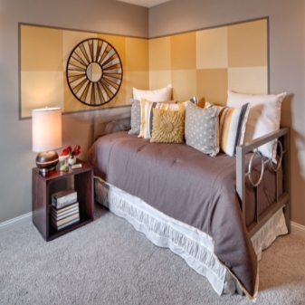 على سبيل المثال ، في غرفة المعيشة ، من الأفضل تركيب سرير بلوح أمامي قياسي وفقًا لحجم السرير واللعب بالصور الفوتوغرافية على الحائط أو الشاشة. اترك الظهر الملكي العالي لـ 100٪ من غرفة النوم ، حيث لا يوجد سوى سرير وخزانة ذات أدراج وخزانة ملابس أنيقة بنفس القدر (كرسيان وطاولات بجانب السرير مناسبان ، نحن لا نتحدث عن أي مكان عمل).