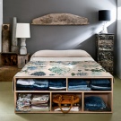 تبدو الأسرة ذات اللوح الأمامي المنخفض والعريض أيضًا غير عادية ، خاصةً إذا تحول مسند الظهر عند الحواف إلى خزانات مدمجة أو صناديق تخزين.