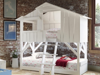 تقليديا ، تصميمات أسرة الأطفال هذه مفتوحة أو مغلقة.. تم تجهيز الموديلات المغلقة بسقف فوق الرصيف ، ولها جدران وأسوار مصنوعة من مواد متينة. اتضح أن المساحة مغلقة تمامًا حيث يمكنك حتى إجراء الإضاءة. تحتوي اختلافات السرير المفتوح في شكل منزل فقط على تقليد لسقف وجدران مصنوعة من مادة أخف بكثير. لذلك ، يبدو هذا السرير متجدد الهواء ولا يفسد غرفة الأطفال..