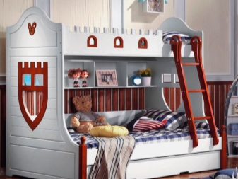سرير من طابقين مزين مثل قلعة الفارس سيثير إعجاب الفارس الشاب. في تصميم السرير ، سيساعد السقف المزخرف ، وكذلك الستارة الجميلة ، في إنشاء زاوية مريحة للطفل ، حتى لو كانت الغرفة كبيرة والسقوف عالية. يمكنك محاولة صنع مثل هذا النموذج على شكل منزل بيديك من أي سرير عن طريق إضافة مظلة خفيفة على شكل سقف. سيكون من السهل غسلها لاحقًا..