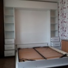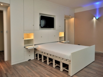 في مثل هذه الأنظمة ، يكون السرير مدمجًا في الأثاث المثبت. في هذه الحالة ، يتم استكمال التصميم بالعديد من الأدراج أو الركائز المساعدة. تقع بالقرب من السرير نفسه ولا تتحول معه.. يجب ملاحظة العديد من الميزات الإيجابية لهذا المنتج: