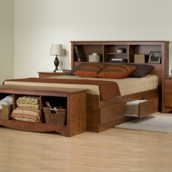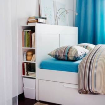 - بريمنيس ، إيكيا. ربما يكون السرير الأكثر شهرة مع مساحة تخزين إضافية. النموذج متوفر بمقاسين 140 × 200 سم و 160 × 200 سم ويحتوي على 4 أدراج للتخزين في الأسفل وخزانة كتب في الرأس مع أرفف مفتوحة من الجانبين. من مزايا السرير ، تجدر الإشارة إلى وجود ثقب إضافي للأسلاك على الرف العلوي (مصابيح أرضية أو “شحن” للجوال) وتصميم مناسب للكتب ، وكل الأشياء الصغيرة الضرورية. إذا تحدثنا عن مادة السرير ، فهي عبارة عن لوح خشب مضغوط وألواح ليفية مغطاة بفيلم..