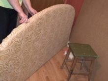 قم بتغطية هيكل السرير ورأسه بمطاط رغوي ، ثم قم بتشغيل رأس السرير فقط باستخدام المفروشات النسيجية. ضع علامات على الإطار لربط الرافعة (4-6 مسامير لكل جانب). لف القماش فوق إطار السرير وثبّت “الرافعات” التي ستوصل الصندوق وقاعدة تقويم العظام. قم بربط الصفائح بالأخير (يمكن القيام بهذه الخطوة من قبل ، ومع ذلك ، فإن العمل على تركيب المصعد الغازي سيكون أكثر صعوبة). قم بتوصيل إطار السرير باللوح الأمامي ، وقم بتثبيت ألواح الخشب الرقائقي في الأسفل (الأرضية).