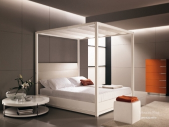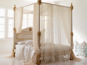 السرير ذو الأربعة أعمدة هو الحل الأصلي. في القرون الماضية ، ظل هذا العنصر دافئًا. لتصنيعها ، تم استخدام نسيج كثيف مع بطانة. اليوم ، تخدم المظلة فقط وظيفة زخرفية. يخلق حالة مزاجية خاصة في غرفة النوم ، ويملأها بالراحة والتفرد. أيضا ، يمكن أن تساعد المظلة في تقسيم المساحة. إذا كانت الشقة لا تحتوي على غرفة نوم منفصلة ، يمكنك استخدام ستارة لتسييج السرير ، مما يخلق جوًا من الخصوصية.
