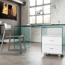 المكتب ذو السطح الزجاجي الفاخر الذي يرتكز على ساق معدنية مثالي للديكور الداخلي الحديث. مثل هذا المنتج لن يفسد الداخل ، بل على العكس من ذلك ، فإنه سيضيف التهوية..