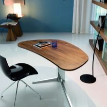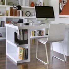 سيساعد النموذج ، المعلق في الهواء وله منحنيات على كلا الجانبين ، في خلق انطباع بخفة الداخل ، دون زيادة التحميل عليه. يساعد الرف المنزلق المريح للوحة المفاتيح على وضع جهاز كمبيوتر على مثل هذا المنتج وترك مساحة خالية في منطقة العمل.