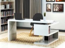 النموذج الأبيض اللامع لمكتب مع خزانة ذات أدراج سيركز كل انتباهك في العمل ، دون تشتيت الانتباه عن الورقة. ستسمح لك الصناديق المريحة بوضع جميع السمات التي تحتاجها في العملية. منحنيات مثيرة للاهتمام للساق وطاولة ستضيف الأصالة إلى النموذج.