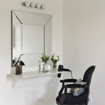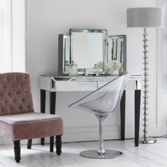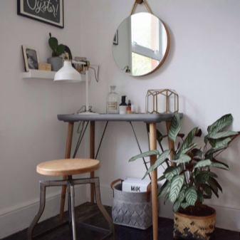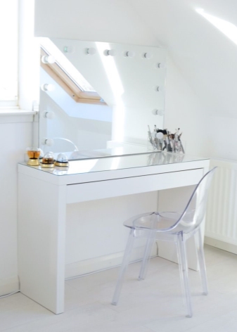 - أبعاد. أولاً ، يجب أن يكون الجلوس على الطاولة وأمام المرآة مريحًا. إذا كان المقعد سيستخدمه عدة أشخاص ، فمن المنطقي اختيار طراز بارتفاع قابل للتعديل. ثانيًا ، إذا كانت الغرفة صغيرة ، فلا ينبغي أن تشوش المساحة. مثالي إذا كان من الممكن دفع الكرسي أسفل الطاولة بعد الاستخدام.