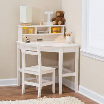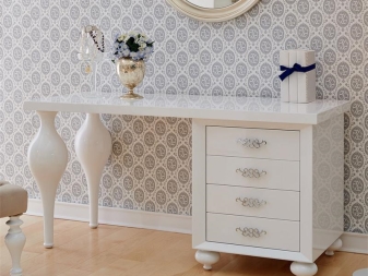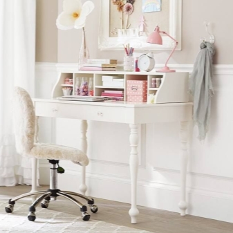 - لتحقيق التناغم ، يمكنك شراء طاولة بهيكل علوي وخزانة ذات أدراج إضافية. يبقى استكمال المجموعة مع كرسي من نفس اللون والأسلوب ومصباح طاولة مع عاكس الضوء. لذلك ، ستصبح منطقة العمل الأنيقة مكانًا مفضلاً في الغرفة ؛