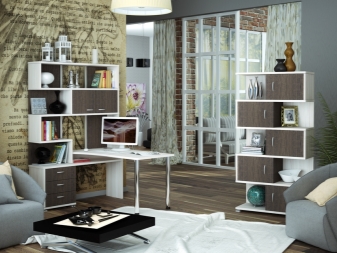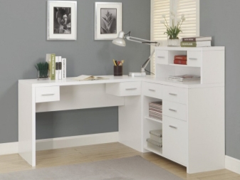 الخيارات الأولى هي إنشاءات من النوع المباشر. يمكن أن تحتوي على ألواح جانبية مع أرفف وأدراج وصناديق منفصلة وخزائن. تتميز الهياكل الثانية بوضع أكثر عقلانية ، لأن لها زاوية. إنها مريحة في ذلك ، اعتمادًا على النموذج ، يمكنها تخفيف زاوية الغرفة. تنقسم هذه النماذج إلى قطعة واحدة ، تتكون من جدول واحد ، ووحدات معيارية ، عنصر الزاوية منها هو مكون منفصل للهيكل..