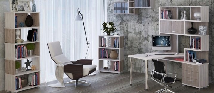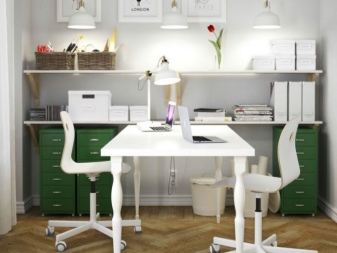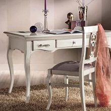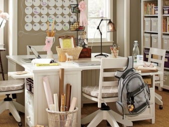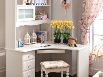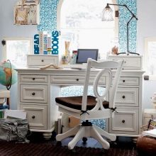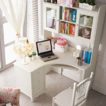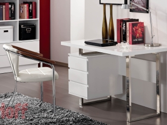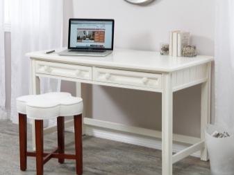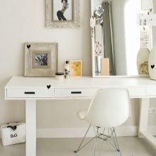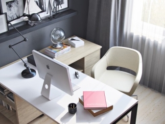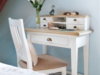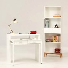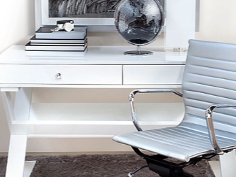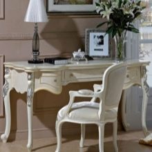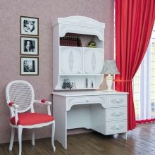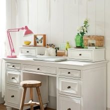 - لتحقيق التناغم ، يمكنك شراء طاولة بهيكل علوي وخزانة ذات أدراج إضافية. يبقى استكمال المجموعة مع كرسي من نفس اللون والأسلوب ومصباح طاولة مع عاكس الضوء. لذلك ، ستصبح منطقة العمل الأنيقة مكانًا مفضلاً في الغرفة ؛