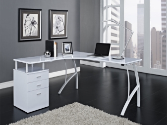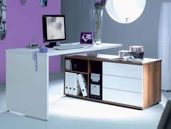 الخيارات الأولى هي إنشاءات من النوع المباشر. يمكن أن تحتوي على ألواح جانبية مع أرفف وأدراج وصناديق منفصلة وخزائن. تتميز الهياكل الثانية بوضع أكثر عقلانية ، لأن لها زاوية. إنها مريحة في ذلك ، اعتمادًا على النموذج ، يمكنها تخفيف زاوية الغرفة. تنقسم هذه النماذج إلى قطعة واحدة ، تتكون من جدول واحد ، ووحدات معيارية ، عنصر الزاوية منها هو مكون منفصل للهيكل..