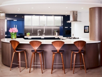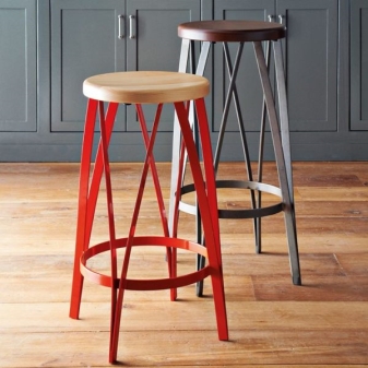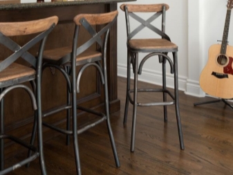 ليس فقط المقاعد الكلاسيكية ، ولكن أيضًا كراسي البار تحظى بشعبية كبيرة اليوم. هذا الأثاث له تصميم مختلف. كقاعدة عامة ، لديهم أرجل أعلى متباعدة إلى أسفل ، يكملها لوح عرضي ضيق. هذه المنتجات تبدو أنيقة وجذابة للغاية..