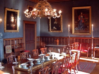 تبدو الكراسي العتيقة المصممة عضوية في التصميمات الداخلية الفاخرة مع جدران خشبية صلبة وطاولة خشبية كبيرة ولوحات كبيرة بإطارات باهظة الثمن وثريا مذهبة ضخمة مع شموع.