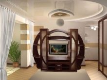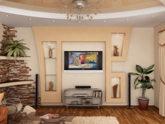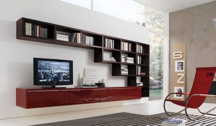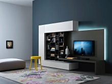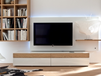 يتمتع التلفزيون المعلق ، المؤطر في دائرة بواسطة أنظمة التخزين ، بعدد من المزايا من حيث الوظيفة والتصميم على الأجهزة الموجودة على قواعد أو أرفف. يصبح التلفزيون غير متاح للأطفال والحيوانات ، وله ارتفاع أكثر راحة للمشاهدة ويتناسب بشكل أنيق مع الداخل.