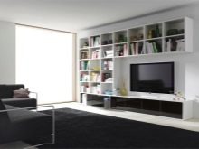 لا يعد إنشاء منطقة تلفزيون منفصلة مجرد نزوة تصميمية ، ولكنه أيضًا وسيلة لاستخدام المساحة الموجودة على الجوانب وحول التلفزيون بطريقة مريحة وعملية وعملية. في الواقع ، في معظم الحالات يظل غير مستخدم. من خلال تثبيت الحائط ، يمكن تحويله إلى مخزن للكتب والإلكترونيات والممتلكات الشخصية بفضل القدرة على تثبيت عدد غير محدود من جميع أنواع الأرفف والرفوف والركائز. بالطبع ، ضمن المساحة الحرة.