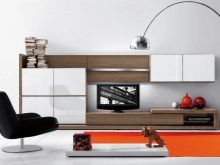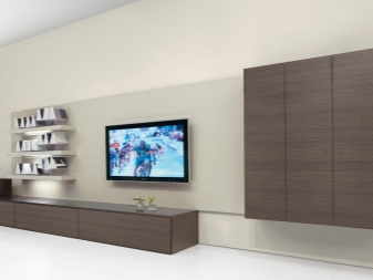 - خزانة حائط. الخيار الأكثر بساطة. إنها بنية طويلة يمكن أن تكون بمثابة حامل تلفزيون ، أو تعمل ببساطة كنظام تخزين إضافي عندما يكون التلفزيون معلقًا على الحائط باستخدام الأقواس. يمكن أيضًا استكمال حجر الرصيف بالعديد من الأرفف أو الخزائن المعلقة.