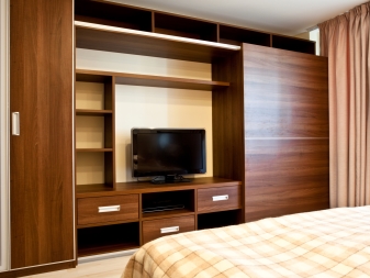 - خزانة حائط. هذا النوع من جدار التلفزيون أكثر ضخامة ، ولكنه أيضًا أكثر فاعلية. إنها خزانة ملابس أو خزانة ملابس كاملة الانزلاق مع العديد من مناطق التخزين ومكان مناسب أو فترة راحة للتلفزيون.