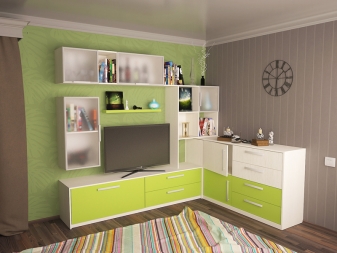 - ركن. نظرًا للخصائص الداخلية أو ببساطة ، إذا رغب المالك ، في تحويل مساحة الزاوية إلى منطقة قابلة للاستخدام ، فإن أفضل حل هو شراء منتجات الزاوية بالضبط. في تكوينها ، قد تحتوي على عناصر مختلفة ، لكن الاختلاف الأكثر أهمية بينهما هو التباين في موقع التلفزيون. في جدران الزاوية ، من الممكن ترتيب مكانة أو رف للجهاز في أحد أجزاء الحائط وفي الوسط..