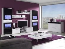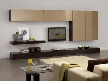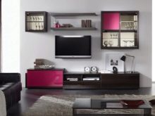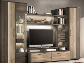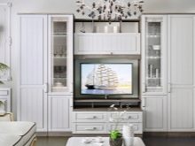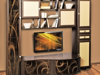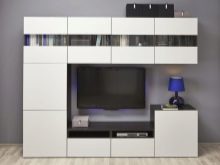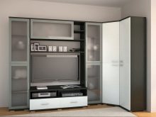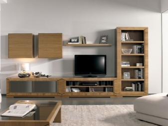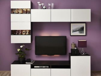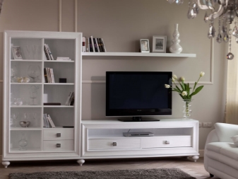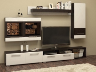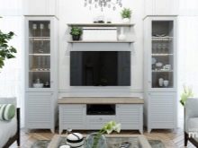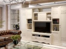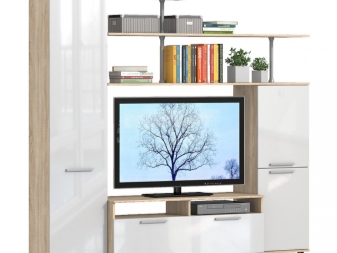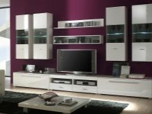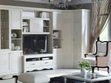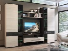 يمكنك وضع جدار صغير في غرفة صغيرة. تقدم العديد من الشركات مجموعات ساحرة تتكون من حامل تلفزيون ورفوف وظيفية ورف. قد تكون المعدات مختلفة ، الشيء الرئيسي هو تحديد الأغراض التي تحتاجها للأثاث.