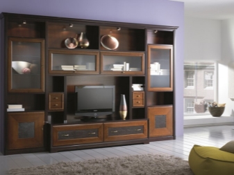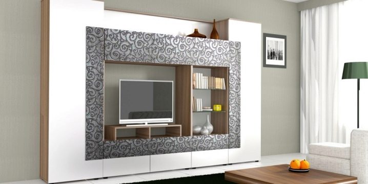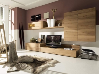 الجدران المصنوعة من اللوح الرقائقي و MDF أكثر بأسعار معقولة. غالبًا ما يتم الجمع بين هذه المواد. جسم الوحدات مصنوع من اللوح. يستخدم MDF للواجهات. يعطي التشطيب بفيلم عالي الجودة للوحدات اللون واللمعان والأنسجة المختلفة. هذا يسمح لسماعات الرأس أن تبدو كريمة تمامًا وتزين أي غرفة معيشة بمظهرها..