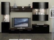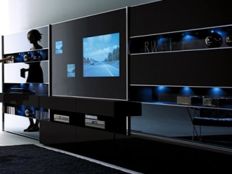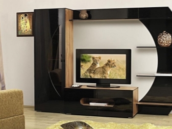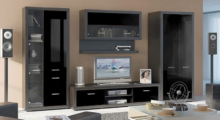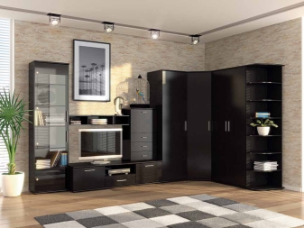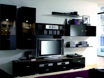 بالنسبة للغرفة الصغيرة ، يكون الجدار الصغير مناسبًا ، ويتألف من خزانة صغيرة وخزانة ورفوف مفتوحة. يعوض الشكل غير العادي واللمعان اللامع للواجهات عن مجموعة متواضعة من سماعات الرأس. لا يبدو اللون الأسود للأثاث في غرفة فاتحة قاتمًا على الإطلاق ، بل على العكس من ذلك ، إنه تسليط الضوء على جذب الانتباه..