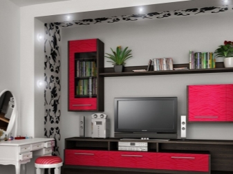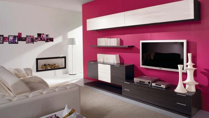 وهنا مجموعة حديثة مصنوعة بألوان زاهية. سوف يتناسب ظل التوت العصير تمامًا مع شقة أصحاب الديناميكية والبهجة. مثل هذا الجدار قادر على تحويل وملء غرفة مزينة بألوان محايدة بألوان. تجعل الملحقات التي تعكس ظل سماعة الرأس التصميم الداخلي كليًا ومتناغمًا.