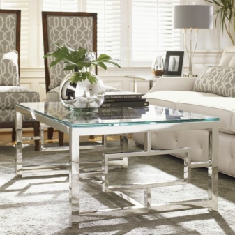 يجب أن نتذكر أن المعدن المراد معالجته معقد ومكلف إلى حد ما. أيضًا ، سيكون وزن طاولة القهوة كبيرًا إلى حد ما. لذلك ، سيكون من الصعب تحريكها في جميع أنحاء الغرفة. الميزة الرئيسية لهذه المنتجات الموثوقية والمتانة. هذه النماذج محمية من التلف.