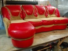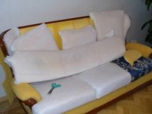 - الآن قمنا بقص الأنماط الناتجة ومغلفين بمفروشات جديدة ، أولاً الأجزاء القابلة للإزالة من الأريكة ، ثم إطارها. كما في الحالة السابقة ، يجب أن تراقب بعناية التوتر المنتظم للمادة على أجزاء الأريكة..
