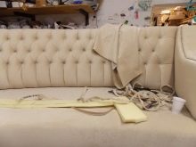 الميزة الثانية هي أنه إذا كان الأثاث قديمًا جدًا ولم يكن نسيج المفروشات قد تآكل فقط ، فسيكون من الضروري أثناء النقل ليس فقط استبدال المواد ، ولكن أيضًا جزئيًا الحشو في الأثاث ، وربما بعض الأجزاء من الإطار.