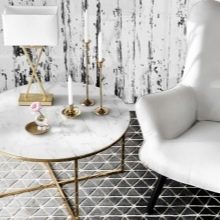 الطاولات الخشبية مصنوعة من الأخشاب الثمينة أو الأشجار الغريبة التي تنمو في البلدان الحارة. هذا هو الحال بالضبط عندما تتلاشى اعتبارات القوة في الخلفية. في المقام الأول ، الجمال الخارجي لنمط الخشب ولونه. يستخدم الحجر أيضًا في طاولات القهوة ، ويتم استخدام الرخام (المصبوب الطبيعي والاصطناعي) والعقيق وأحجار الأكريليك. هذا حل مكلف للغاية ، لكنه مثالي للديكورات الداخلية الكلاسيكية والشرقية..