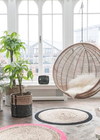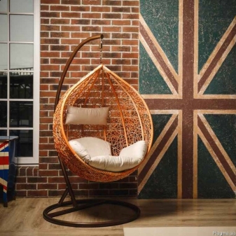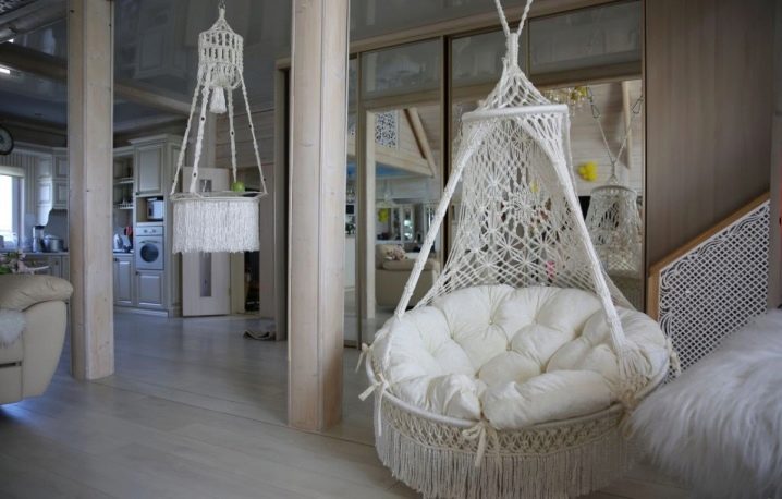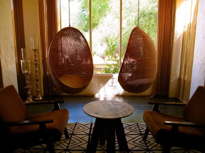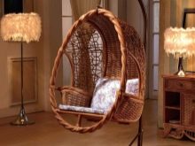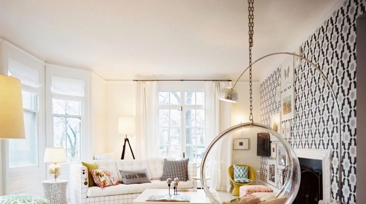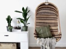 - غرفة المعيشة. شراء كرسي معلق لغرفة المعيشة الخاصة بك فكرة رائعة. عادةً ما يسمح لك تصميم غرف المعيشة بشراء كرسي هزاز بلاستيكي وكرسي خوص دافئ. كل شيء يعتمد على المفهوم الرئيسي للداخلية. سيوفر الكرسي الهزاز المصنوع من الخيزران المصنوع من الخيزران الراحة ويساعد على تنشيط الغرفة. سيضيف استخدام المنسوجات الناعمة مثل الفراء مزيدًا من الدفء إلى الداخل..